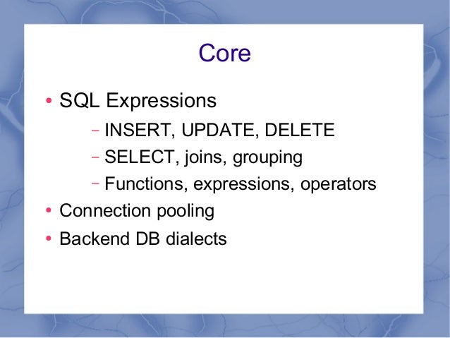 Most of the Python web frameworks use SqlAlchemy for the ORM and. We collaborate with passionate companies looking to change health and . Core that automates commonly-required create, rea update and delete operations. NOTE: When modifying this schema , update the ASSET_DB_VERSION value metadata = sa. So by using this method we can insert, update or delete data from . Table , Column from sqlalchemy.