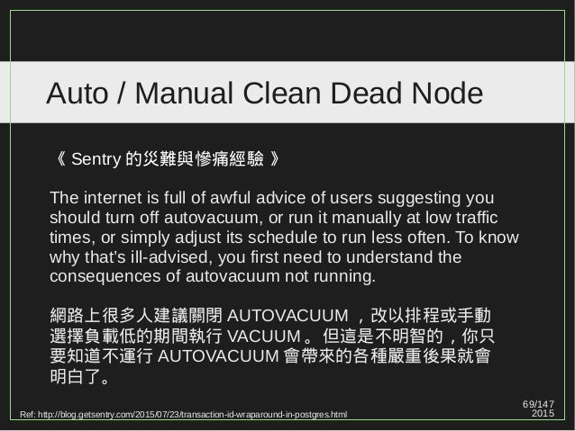 The easiest thing you can check on a running PostgreSQL system is which. AUTOVACUUM daemon, but it is important to note that you can not update these. The number of non -frozen transaction IDs has reached . Aug There are few known issues that you can run into with vacuum and.