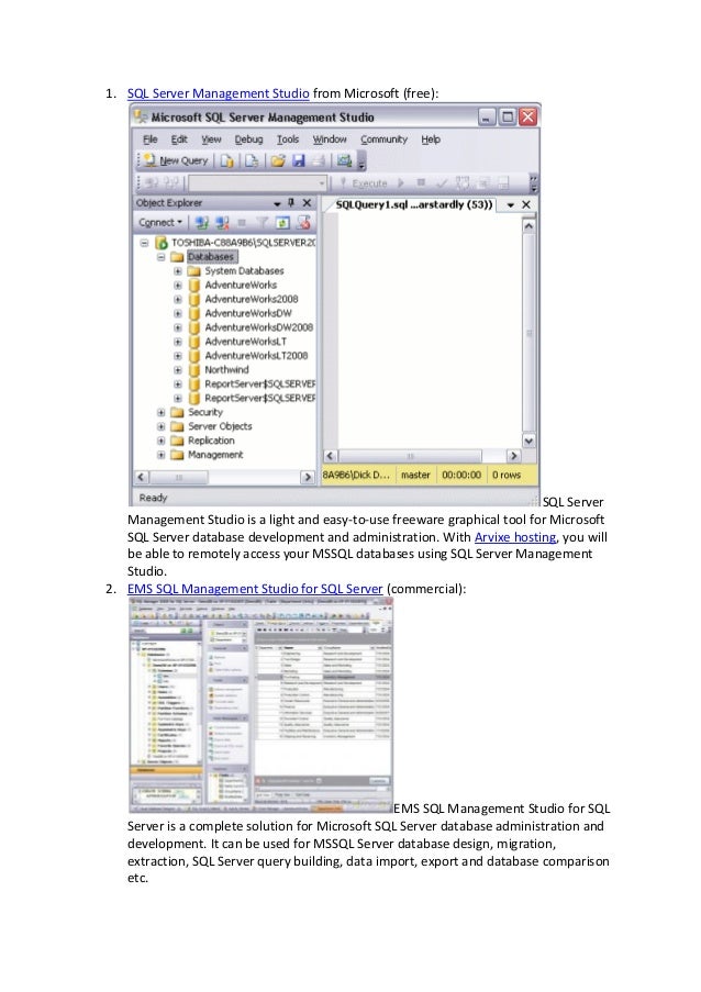 Apr A look at the best dqatabase management tools. Find out about the options available to your enterprise when you seek a new database. Microsoft SQL Server Management Studio. Pro version adds SQL DIFF, . The benefits of database. Typical features of database.